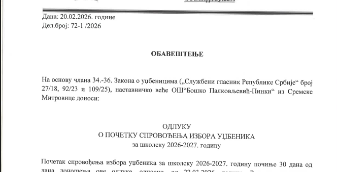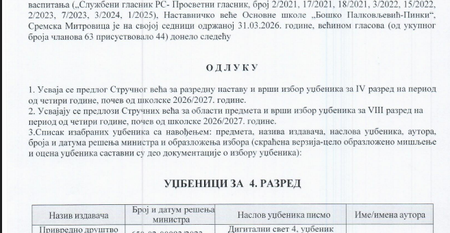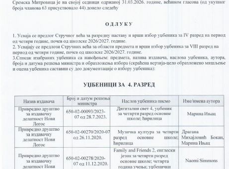 Одлука Наставничког већа и Савета родитеља о избору уџбеника за други и шести разред и списак уџбеника за предстојећу 2024/2025. годину.